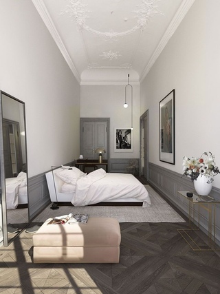 Для пола в узкой спальне лучше всего подойдут любые прямоугольные доски: от классического паркета до современного ламината.