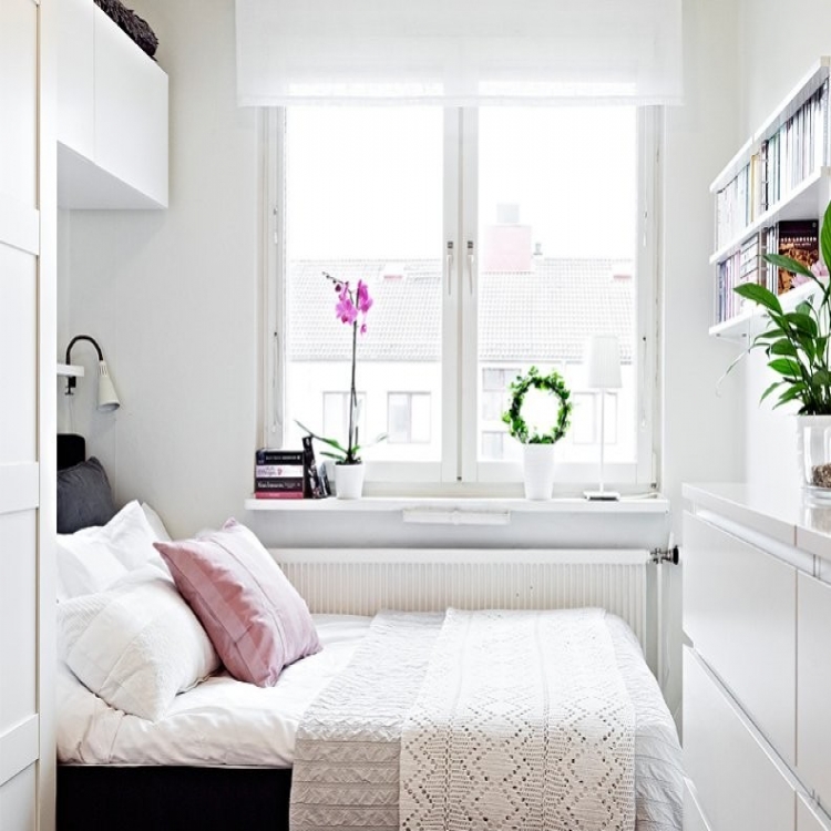 Если помещение настолько узкое и маленькое, что в нем можно разместить только одно спальное ложе, его лучше поставить в самом дальнем углу. Подобное решение является довольно удобным и позволяет занять соседнее угловое пространство столом, шкафчиком или комодом.