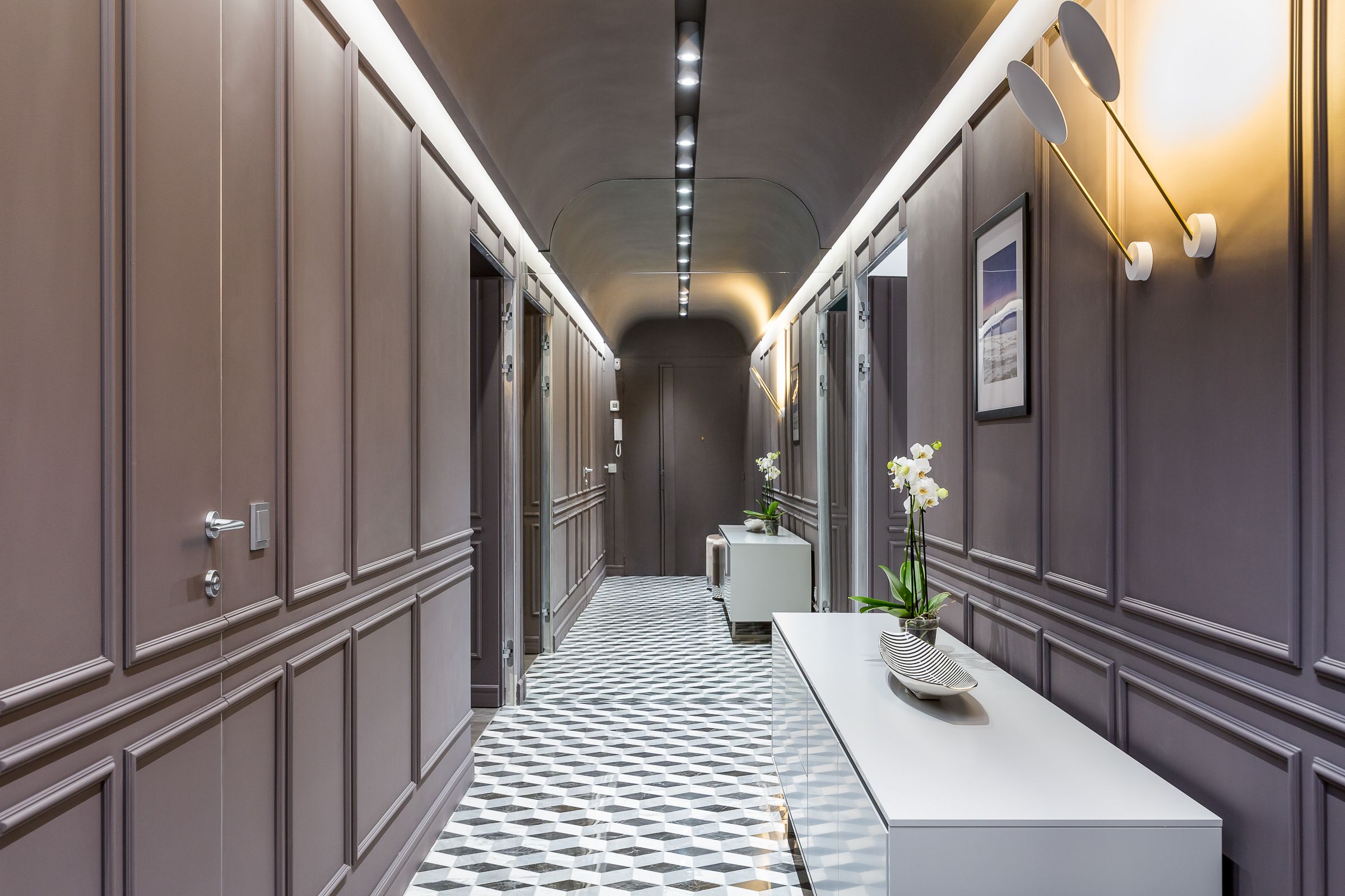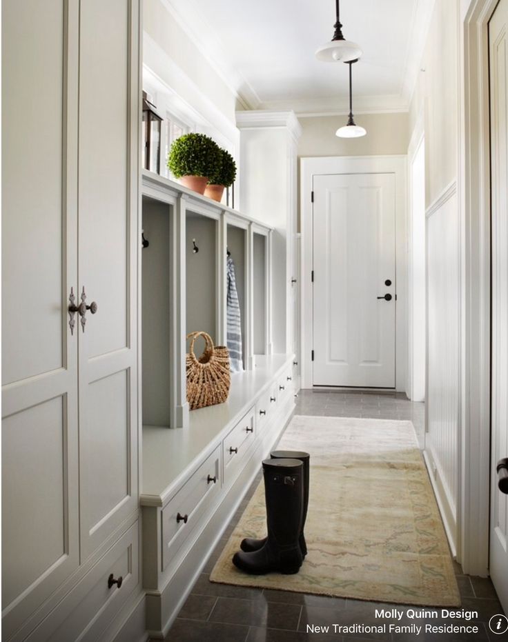 Белый, простой минимализм. Если проход узкий, но его хорошо использовали, добавив шкафы или другие решения для хранения, нет причин добавлять что-то еще.
