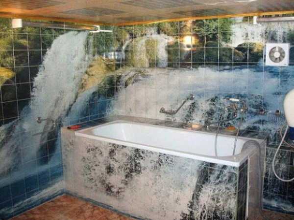 3D технологии позволяют создавать необычные и эффектные дизайны ванной комнаты. Представьте: вы заходите в ванную, а перед вами открывается вид на море с песчаным пляжем, или вы оказываетесь в морской пучине. Но для небольших помещений 3D материал надо использовать с осторожностью, лучше отделать ей небольшой фрагмент помещения. Вы можете изучить какая бывает 3д плитка в ванную, и ее основные плюсы минусы.