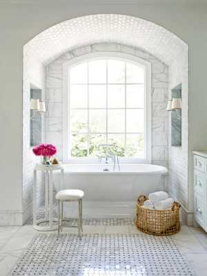 Плитка «под мрамор» поможет сохранить светлый образ помещения, не делая при этом его стерильно чистым и похожим на больничную палату. Даже маленькому помещению можно добавить изысканности за счет использования имитации под благородный камень.
