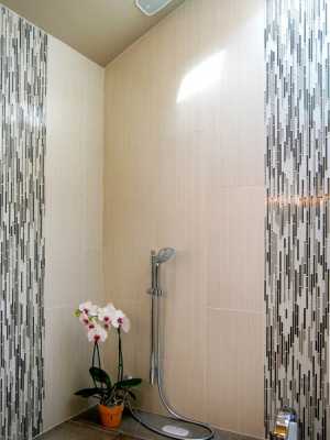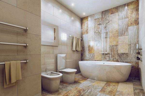 - Вертикальный – пребывает на пике популярности, он основан на использовании плитки одного тона на полу и одной из стен, тон как бы спускается от потолка и ложится на пол, при этом все остальные стены выполнены в других, более спокойных, приглушенных тонах.