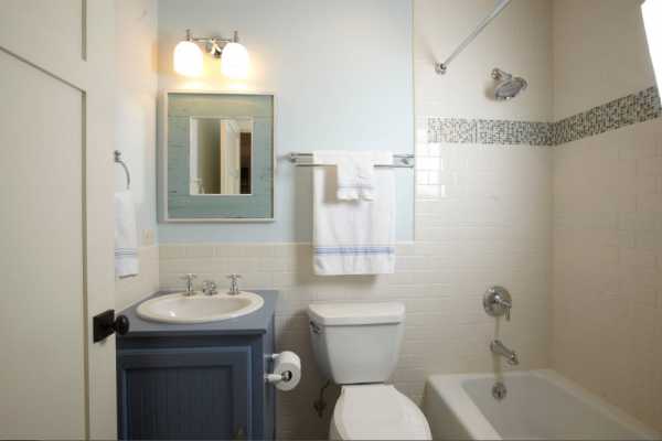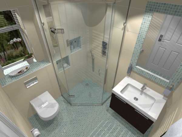 Бежевые стены и голубая плитка-мозаика в маленькой ванной комнате