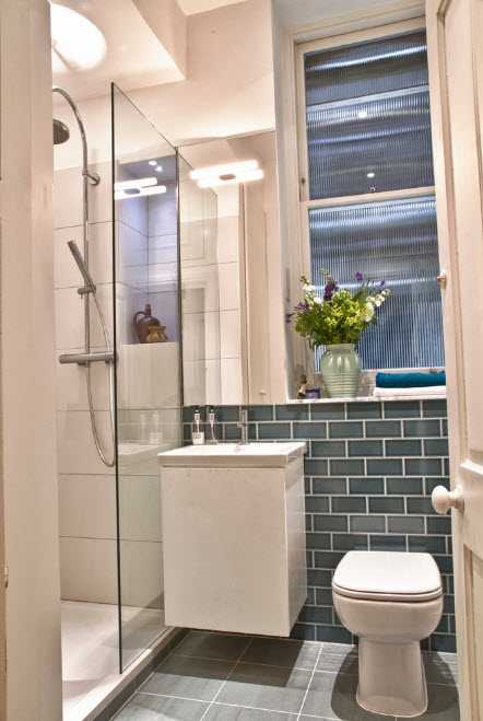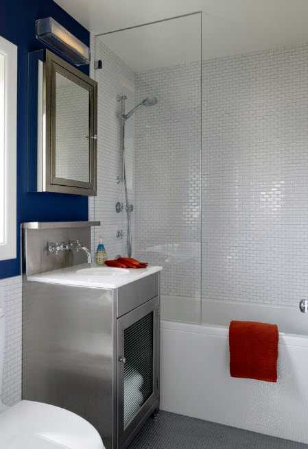 Большая серая плитка для ванной и голубая плитка-мозаика