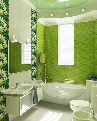 Сейчас очень распространено использование двух типов плитки с разными оттенками или орнаментами в оформлении интерьера комнаты для водных процедур. Ультрамодными считаются альянсы зеленого и красного, оранжевого и синего, а также желтого и фиолетового цветов.