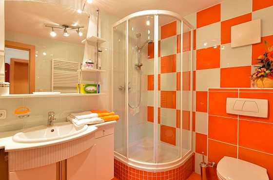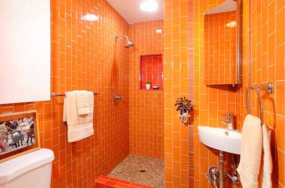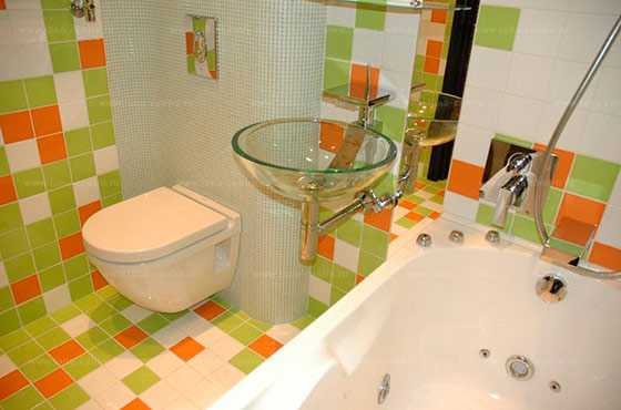 - используйте для стен несколько ярких насыщенных оттенков. Сочетайте оранжевый с фиолетовым, красный с зеленым, оранжевый с желтым и зеленым. Разбавьте яркость белым кафелем, или используйте только сочные цвета. Никакое другое помещение в квартире не вытерпит такого всплеска эмоций, а вот ванная и туалет – отличный вариант для островка позитива. Каждый раз, заходя в это помещение, вы почувствуете прилив энергии и радости;