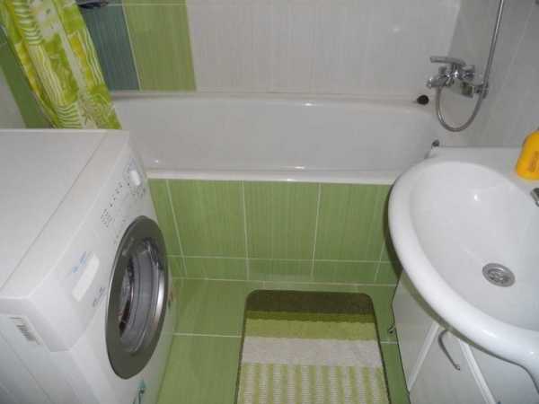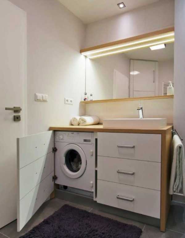 Если устанавливается плоский умывальник его подключение выше обычного, то стиральная машинка под ним замечательно впишется. Также можно установить их рядом под одну столешницу.