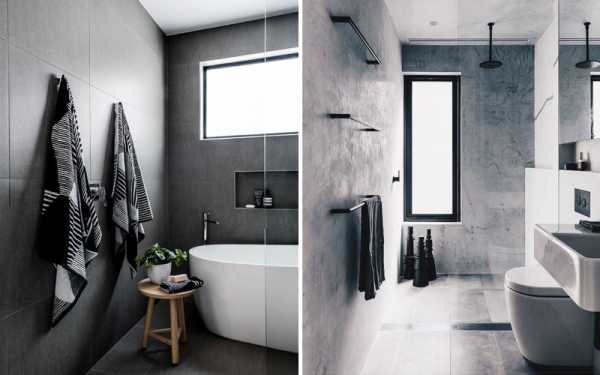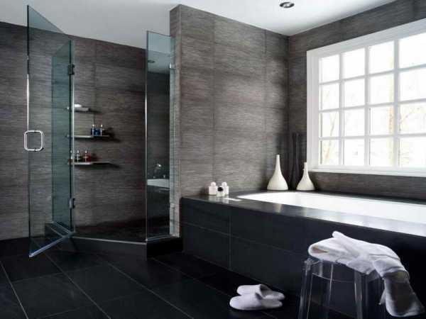 Дизайн ванной комнаты в сером цвете с отделкой стен керамогранитной плиткой