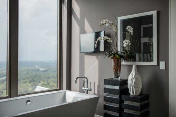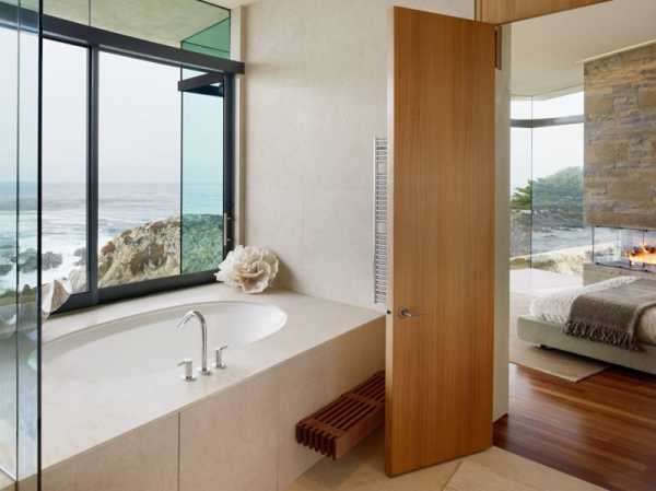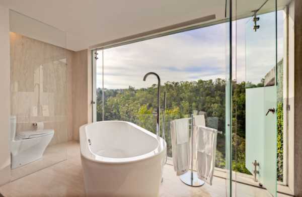 Дизайн ванной комнаты с большим панорамным окном