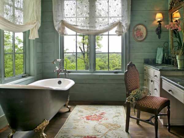 - Прованс. Сочетает в себе деревенскую простоту и французский шик. В отделке пола стоит использовать натуральную древесину или ее качественную имитацию. Стены можно покрасить, отделать обоями или декоративной штукатуркой. Романтичный интерьер прованса создают с использованием природных пастельных тонов: лилового, оливкового, мятного и других. Желательно, чтобы мебель во французском стиле была изготовлена из выбеленного дерева, а сантехника имела старинный вид. Окно следует задекорировать легкими шторами из натуральной ткани: ситца, льна, хлопка. Занавеси могут быть как однотонными, так и с изображением цветов.