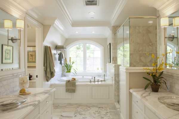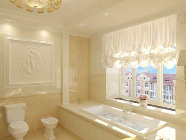 - Классицизм. В основе этого стиля – демонстрационная роскошь. При оформлении ванной комнаты можно использовать позолоту и лепнину. На пол рекомендуется уложить паркет, влагостойкий ламинат или керамическую плитку с имитацией мрамора. Для стен подойдут моющиеся обои с неярким флористическим узором или венецианская штукатурка. Для вертикальных и горизонтальных поверхностей подбираются спокойные тона: белый, молочный, песочный, бежевый, кремовый, светло-коричневый, розовый, оливковый. Предметы мебели и декора можно выделить насыщенными, богатыми тонами: гранатовым, болотным, винным, шоколадным. Окно санузла в классическом стиле следует украсить пышными шторами с ламбрекенами. Отличный вариант – установить в верхней части оконного проема ламбрекен из плотной тяжелой ткани, а нижнюю часть задрапировать шторами из более легкого материала.