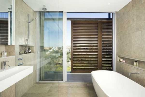 - Если ванная комната располагается в частном доме с огороженной территорией, то ее хозяева не боятся посторонних взглядов и могут оставить окно открытым для обзора. Устанавливая окно в ванной квартиры, необходимо обеспечить достаточную приватность: повесить шторы или даже установить ставни.