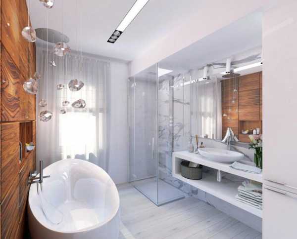 - Даже если в ванной имеется окно, не стоит забывать об искусственных источниках освещения. Количество и дизайн светильников зависит от выбранного стиля интерьера и площади помещения.