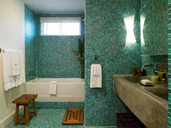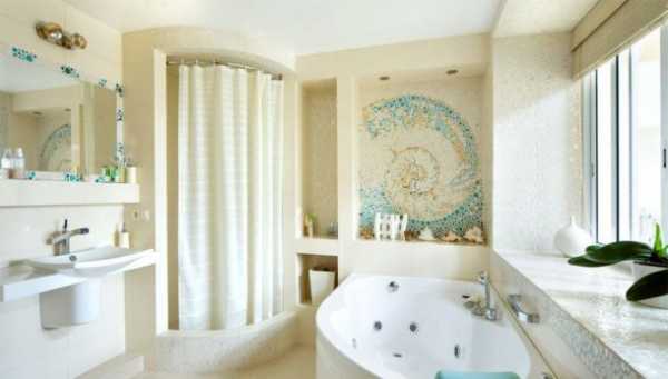 Дизайн ванной комнаты выполнен в морском стиле с мозаичной плиткой