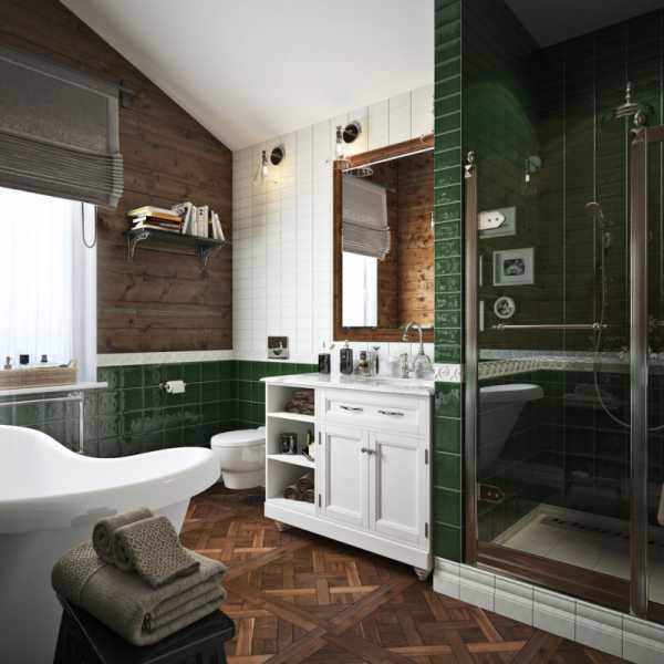 Дизайн ванной комнаты с оконным проемом ни в коем случае не должен быть слишком вычурным. Ведь окно в помещении будет главным элементом. Стиль комнаты разумнее всего подбирать в зависимости от пейзажа за окном. Если это зеленая полоса или небольшой водоем, то удачно дополнить его поможет интерьер в стиле эко. Он подразумевает использование природных, экологически чистых материалов. Цветовая гамма его полностью повторяет натуральные оттенки самой природы – свежая зелень молодых листьев, кора дерева, земляные оттенки и песочная палитра будут преобладающими. Стены и пол можно облицевать кафельной плиткой, поверхность которой по цвету и фактуре имитирует дерево или натуральный камень. Для смягчения обстановки можно расположить перед ванной или душевой пушистый коврик мягкого зеленого оттенка. В таком интерьере очень гармонично выглядят стеклянные элементы. Будь то настенные полки или столешница из каленого стекла.