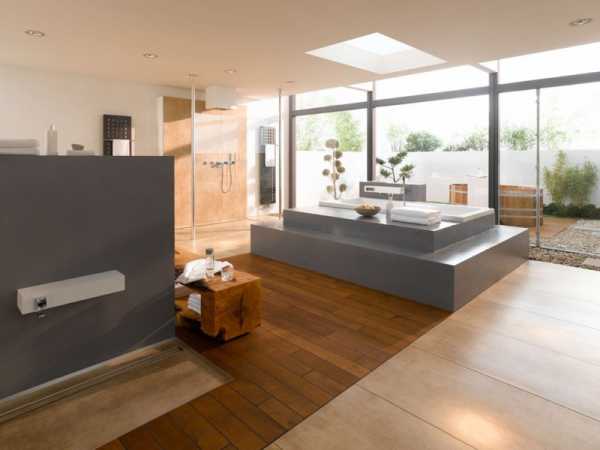 - Размещение мебели в комнате с панорамным окном. Помещения с такими окнами обычно подразумевают простор и полную свободу действий. Их метраж ничем не уступает настоящим комнатам. Это дает вам возможность расставить мебель как угодно, по своему вкусу. Наиболее распространенное размещение самой ванны при этом – прямо перед окном. Чтобы вам было удобнее любоваться открывающимся пейзажем, не стоит устанавливать ванну впритык к стеклу. Тем более, даже самые качественные стеклопакеты холодные в зимнее время. Располагайте сантехнику хотя бы на расстоянии метра от окна. Это позволит избежать и скопления конденсата на его поверхности. Очень часто устанавливают джакузи посреди комнаты. Центральное расположение еще более удачное, так как в таком случае остаются свободными остальные стены. Другие предметы не следует расставлять перед панорамным окном, чтобы не загораживать себе вид. Исключением может стать мягкий пуф, небольшая скамейка или компактное кресло для отдыха. Между ванной и окном можно постелить небольшой мягкий ковер. Если окно начинается на высоте около метра от пола, то перед ним можно расположить длинную столешницу с раковиной. Это немного необычное, но довольно интересное решение. Если есть непреодолимое желание установить прямо под ним ванну, то не забывайте про конденсат. В таком случае тумбы, пеналы, корзины для белья и умывальник располагают по обе стороны от окна.