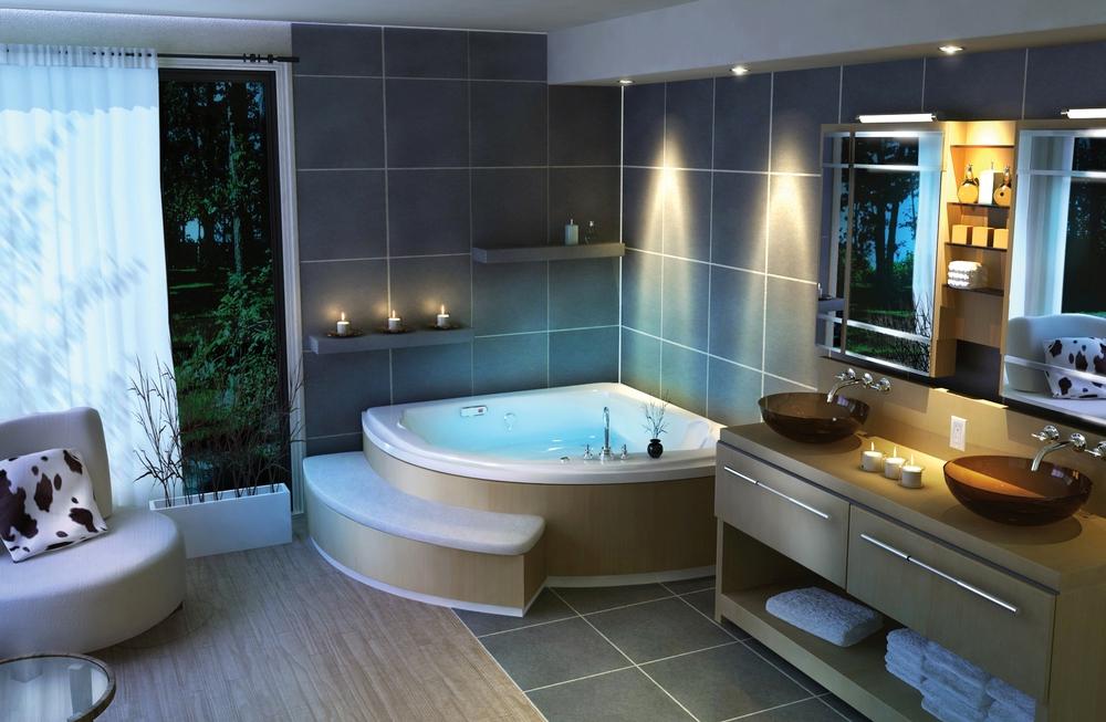 Все это оборудование размещают в угловых частях помещения. В центре располагают пушистый коврик и большое зеркало с подсветкой. Украсить пространство можно многоуровневым потолком. В зависимости от вашего настроения, можно менять световое решение интерьера.