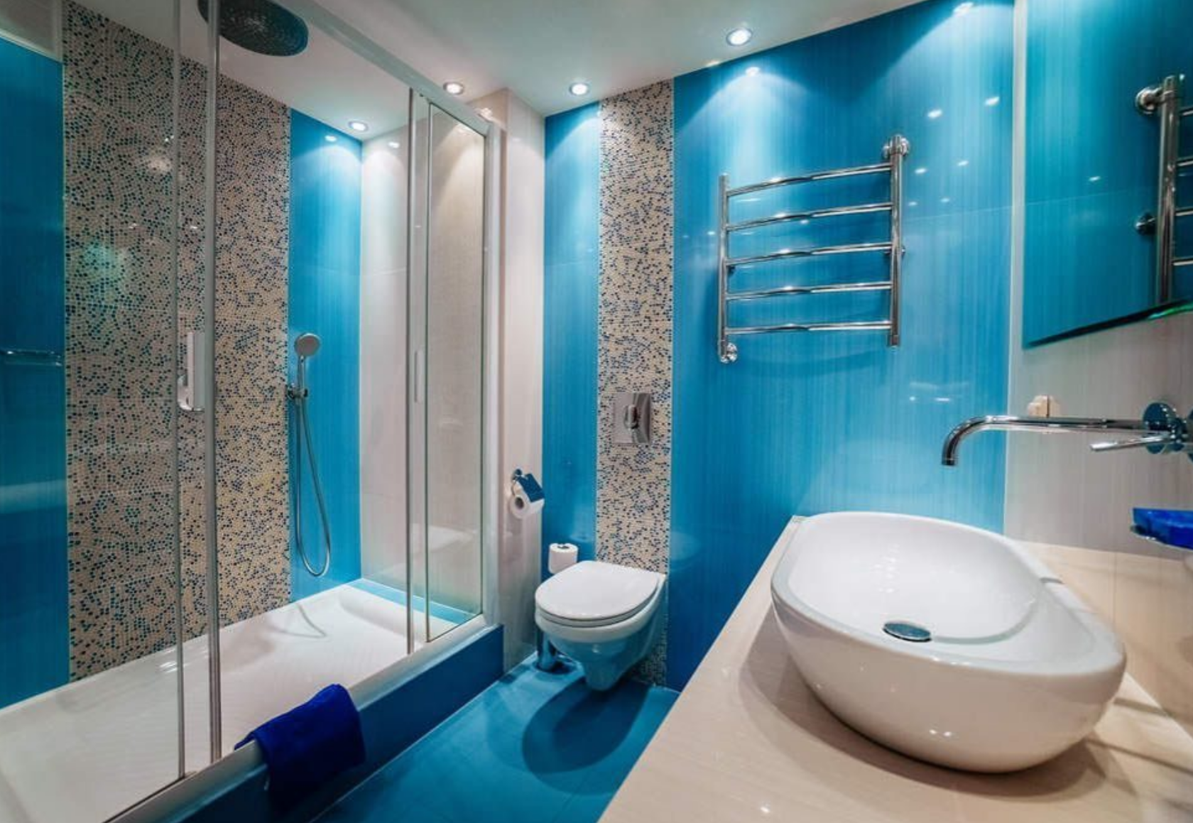 Неглубокие подвесные шкафчики-пеналы для мелочей – оптимальное решение для дизайна маленькой ванной комнаты в современном стиле. Главное – красиво их оформить и подобрать для них подходящие фасады. Для системы хранения над раковиной подойдет зеркальная дверца, а другие подобные элементы можно превратить в оригинальные витрины с помощью прозрачных стеклянных фасадов и голубой светодиодной подсветки.