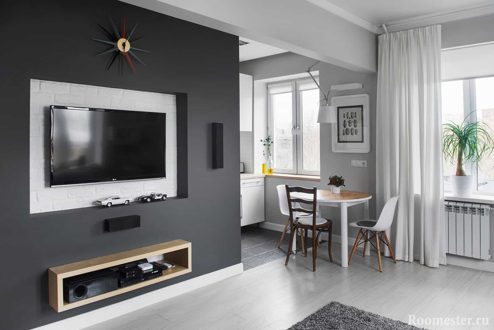 С такой задачей справиться непросто. Конечно, туалет и ванную отгородить от остального пространства необходимо. Но вот кухню и комнату можно оформить как гостиную-столовую.