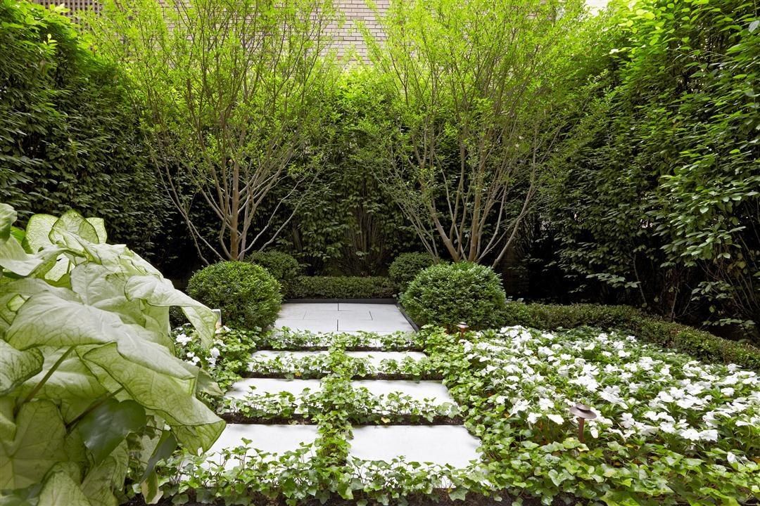 Десятки взрослых пересаженных деревьев окружают этот эллиптический сад с бархатистым газоном.