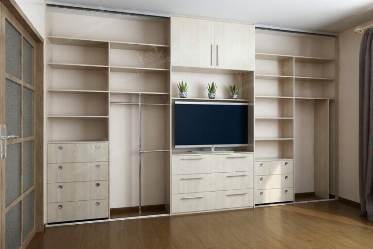 - полки. Они размещаются на разном расстоянии друг от друга с тем, чтобы здесь можно было хранить не только одежду, но и более объемные предметы, например. Постель с подушкой, если гостиная используется как спальня, или бытовую технику, наподобие пылесоса;
