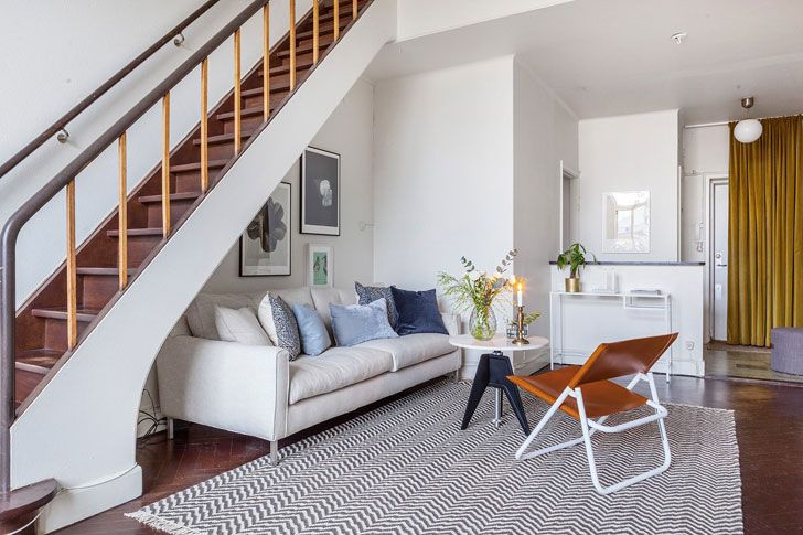 Пространство под лестницей всегда трудно использовать, поэтому размещение дивана может быть хорошей идеей.
