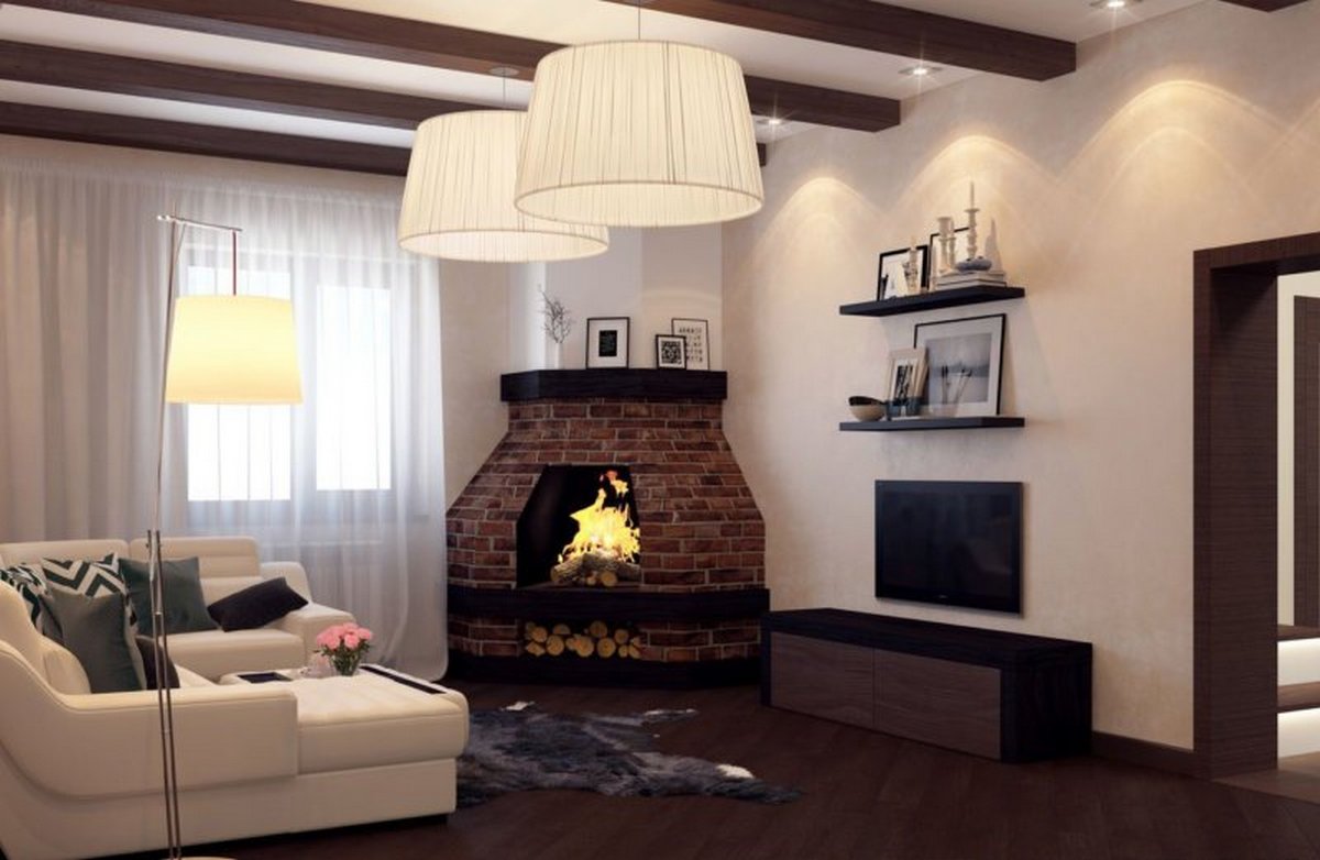Это наиболее выигрышный вариант в плане эстетики. Данное расположение интересно само по себе и не требует дополнительного украшения. Отсутствие равномерного распределения тепла не обеспечит эффективного прогревания комнаты, к тому же большой объём тепла уйдёт в соседние помещения. Угловой камин, расположенный между наружными стенами здания, является наиболее экономически невыгодным вариантом, так как отапливаться будет больше улица, а не жилое помещение.