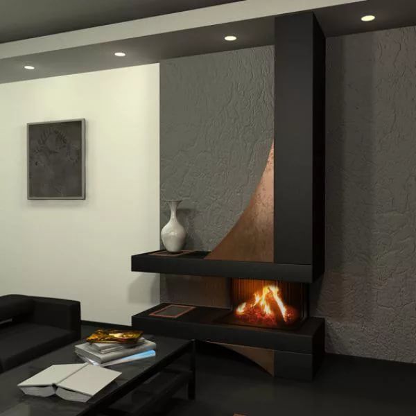 Такой вариант подчеркнет общую строгость помещения, при этом, придавая ему изюминку. Этот же способ установки позволит сэкономить пространство, если речь идет о небольшом помещении. Над ним можно повесить телевизор. Угольно-черный пластик портала прекрасно впишется в лаконичный интерьер, а пляшущие языки пламени станут ярким пятном, создавая загадочную и гармоничную атмосферу.