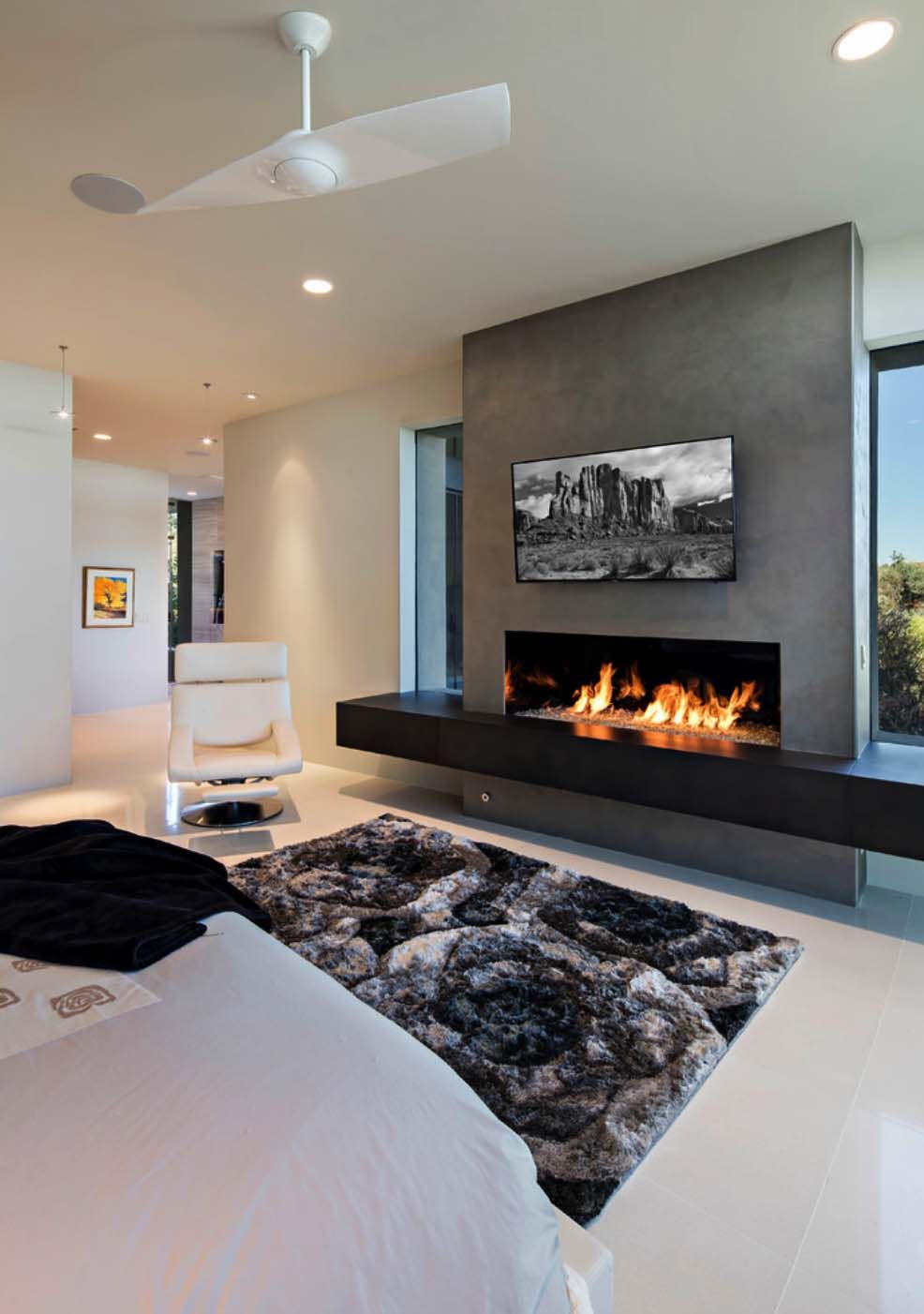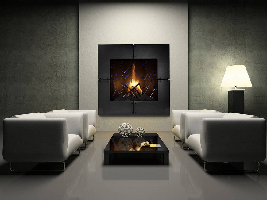 Выбирая отдельностоящий очаг, можно создать по-настоящему уникальный дизайн. Остров пламени посреди комнаты — это интересный элемент в черно-белых тонах гостиной. Если встроить очаг в какой-либо предмет или выступающую часть стены, можно не только создать эксклюзивный элемент декора, но и зонировать пространство.