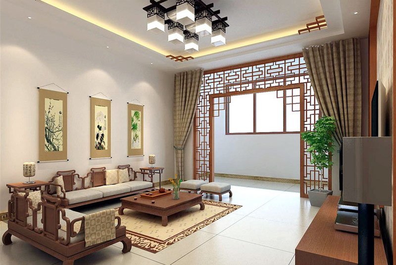 Источник: Home BayПотолок из подносов, а также подвесные светильники имеют отчетливо китайский стиль.Они сочетаются с подходящими бежевыми стенами, украшенными классической китайской росписью. Это хорошо сочетается с ярко-красными диванами, которые выделяются на фоне желтого коврика с бамбуковым орнаментом.