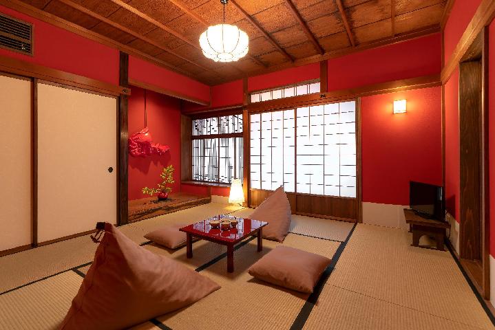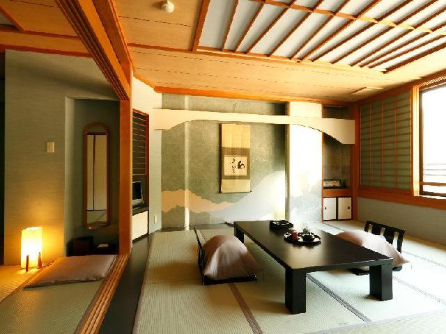 Это традиционная гостиная в японском стиле с бежевыми стенами и паркетным полом, покрытым светло-зеленым татами, сочетающимся с зелеными подушками, на которых сидят люди.Они сочетаются с небольшими деревянными табуретами, которые действуют как столы.