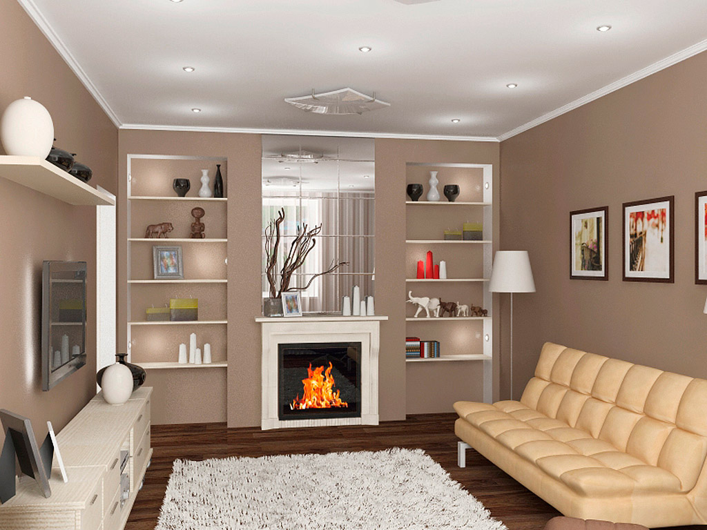 В проект оформления отлично впишется электрический камин, телевизор, напольные вазы, торшеры. Для внутренней отделки можно использовать обои с нейтральным рисунком.