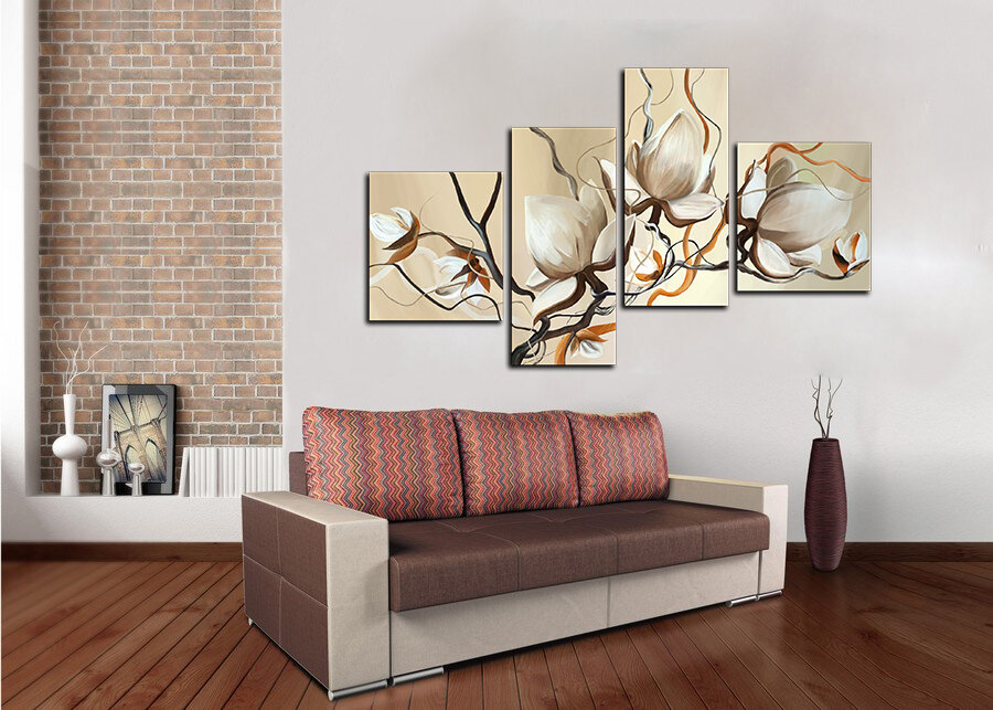 Обязательно учитывайте и размер помещения, а также сочетание холстов с мебелью. Так, например, чтобы диван казался больше, над ним можно повесит несколько небольших картин.