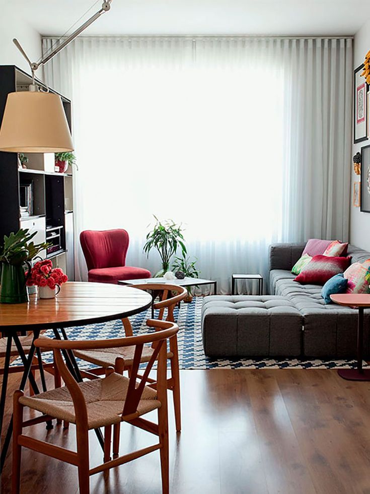 Вы не хотите, чтобы это пространство выглядело загроможденным, поэтому для вас важна небольшая мебель. Встроенные модули могут быть действительно полезны для небольших декоративных предметов и для того, чтобы держать их в порядке и не мешать. Вы хотите, чтобы ваше пространство было воздушным и светлым, поэтому, пожалуйста, держитесь подальше от темных цветов! Рассмотрите нейтральную цветовую палитру с яркими всплесками цвета. Большое количество окон может помочь действительно осветить пространство, но если у вас нет такой возможности, хорошее освещение тоже подойдет. Большое зеркало в гостиной поможет сделать пространство больше.Если вам нужен менее дорогой вариант, купите в IKEA несколько кусочков стекла и прикрепите их к стене. Подумайте о разумных решениях для хранения вещей, например, об использовании функциональной мебели, такой как журнальный столик с ящиками или пуфик с крышкой. Подоконники можно превратить в небольшой уютный уголок для отдыха, просто добавьте подушки и плед. Диван-кровать можно использовать для ночлега, если у вас нет свободной спальни.