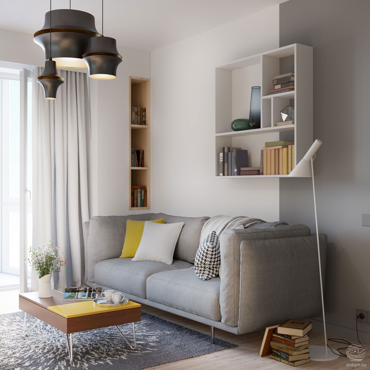 Определяющий момент для небольшой комнаты – свет. Все предельно ясно с естественным освещением – большое окно, легкая тюль. С искусственным освещением всего несколько иначе.