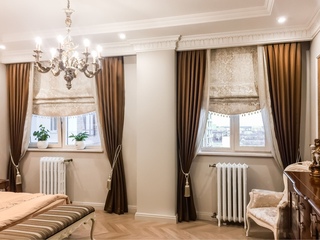 Римские шторы, которые являются единым текстильным полотном. При креплении к карнизу они собираются в ровные складки. Такие гардины хорошо регулируются по длине, поэтому являются одним из самых практичных вариантов. Данный вид гармонично подойдет и для классического, и для ампирного стиля оформления комнаты.- Классический вид штор представляет собой союз прямых или со складками занавесок, плотных портьер и ламбрекена. Портьеры могут как подвязываться, так и находиться в прямом положении. Без такого вида не обойдётся комната в английском стиле или в направлении барокко.