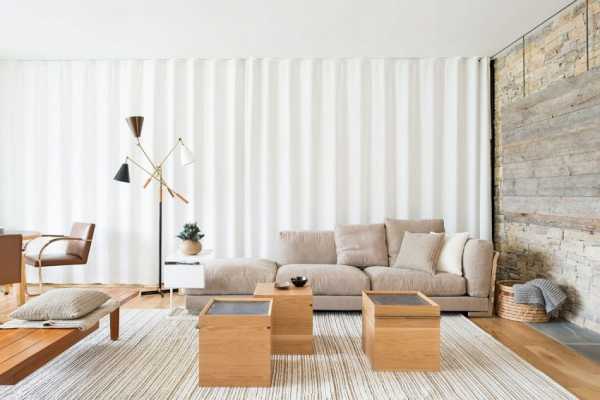 Дизайн гостиной в доме с большими окнами: шторы создают мощный акцент