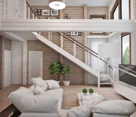 Интерьер в черных и белых тонах в гостиной со вторым светом в деревянном доме