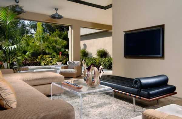Для этого во время ремонтных работ потратьтесь на большие панорамные двери-окна. Они добавят антуража и дороговизны вашей гостиной. В теплое время года же их можно будет полностью открывать, и наслаждаться природой.