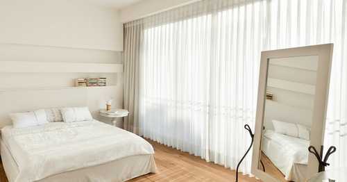 Правильные шторы в стиле минимализм в спальню – это натуральные льняные окрашенные полотна, драпированные в симметричные складки при закрытии проема. Приветствуются иные натуральные ткани. Основное правило – драпироваться в хаотичном порядке и лежать на полу, такие шторы не должны.