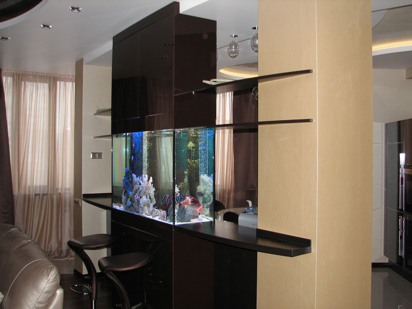 Аквариум в интерьере кухни объединенной с гостиной комнатой, встроенный в перегородку.