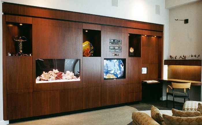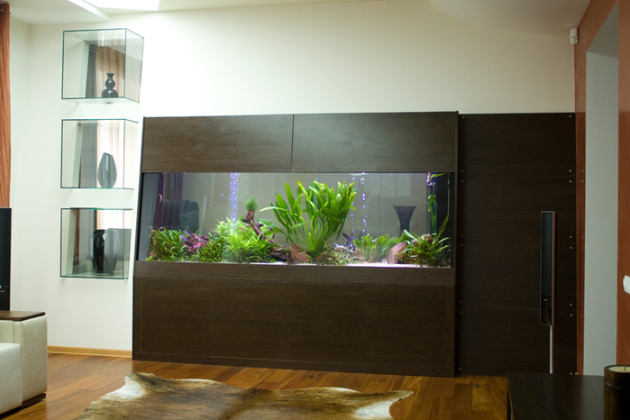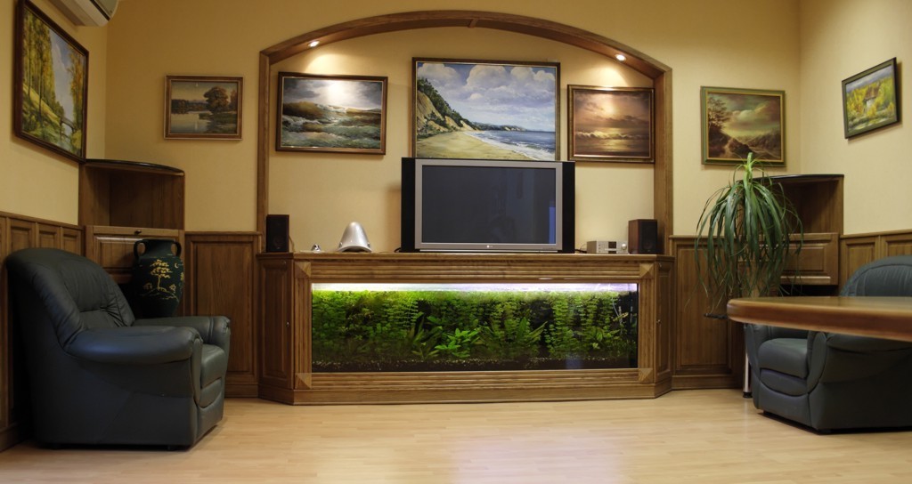Встроенный аквариум в интерьере гостиной, закладывается в дизайн помещения еще на этапе строительства. Обычно для встроенного аквариума разрабатывается специальная ниша с дополнительными дверцами, дающими доступ к аквариумным коммуникациям.