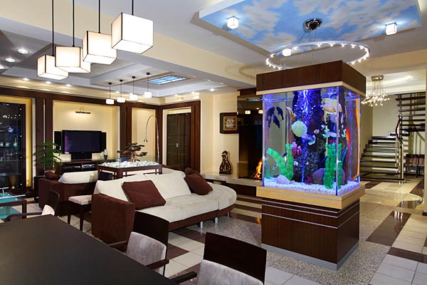 Совет! Подбор формы аквариума лучше доверить профессионалам.Не забывайте о том, что именно гостиную считают центральным местом в доме. Именно тут долгими зимними вечерами собирается семья, ведутся светски беседы с гостями. Необычный аквариум в интерьере гостиной стал привычным явлением. При оборудовании в гостиной любой конструкции для морских обитателей, не допускайте попадания на него прямых солнечных лучей. Оптимальным вариантом будет установка емкости с подводными обитателями в темном месте вашей гостиной. Емкость для рыб можно выбрать, независимо от площади помещения.