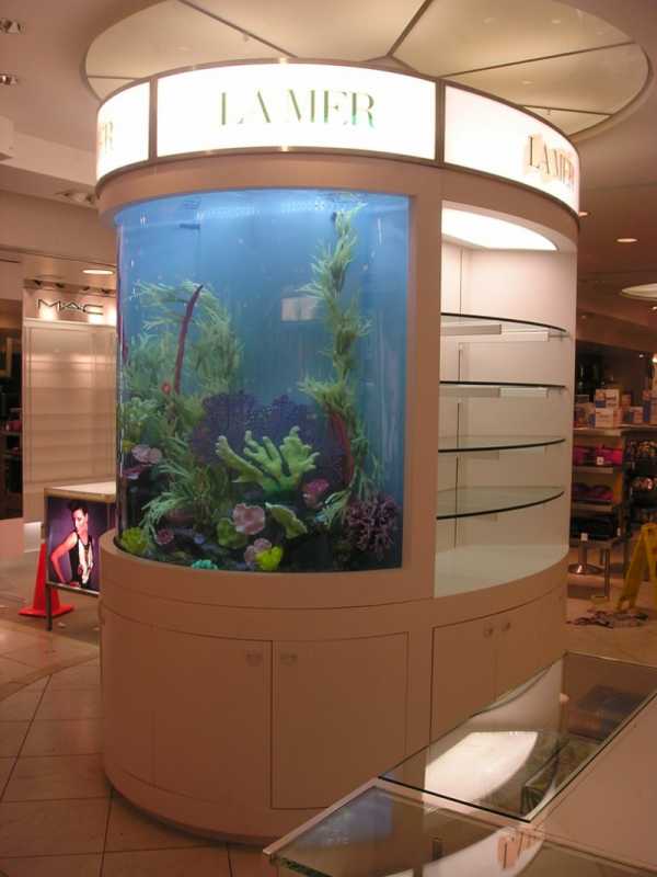 Аквариумы чаще всего бывают прямоугольными, но изготовленные на заказ конструкции могут быть более гибкими с точки зрения формы. Например, этот аквариум от Aquarium Architecture имеет закругленные углы и выглядит немного иначе, чем обычные аквариумы. Помимо подобных «овальных» часто встречаются еще и шестиугольные аквариумы, но обычно они бывают в виде отдельных объектов, а не встроенных.