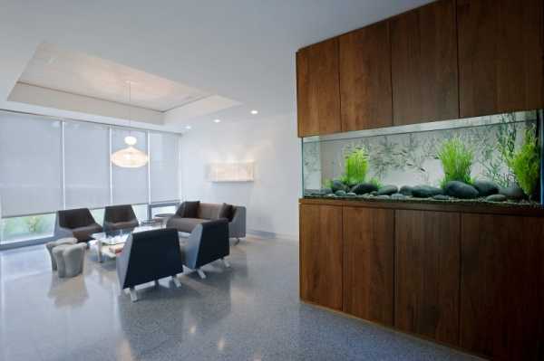 Этот аквариум, разделяющий две части офиса, более простой, но при этом не менее красивый. Наполненный фиолетовыми и зелеными растениями, он добавляет яркие акценты в современный интерьер. Сама перегородка невелика по размерам, что в небольшом помещении только повышает ее ценность. Согласитесь, не каждый офис может похвастаться таким дополнением к интерьеру.