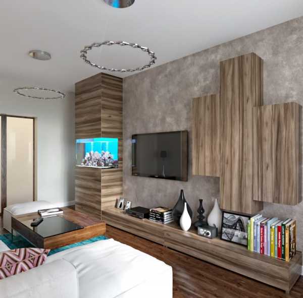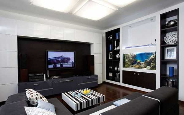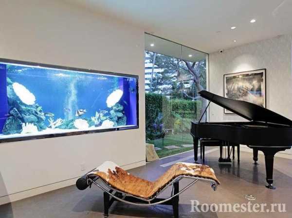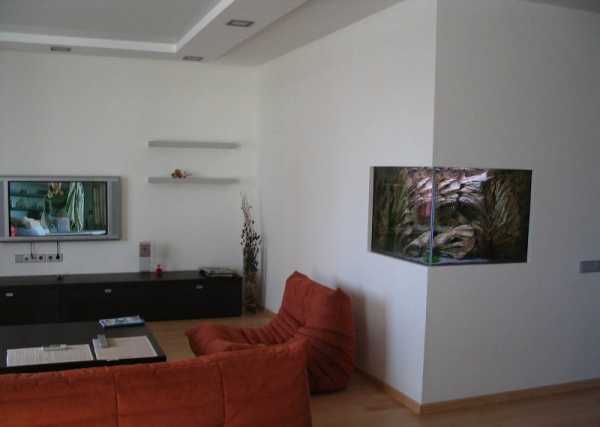 В гостиной аквариумы монтируют в стенке, с двух сторон от телевизора. Время от времени отвлекаясь от динамичного действия на экране, можно расслабиться, разглядывая подводный мир. Аквариум устраивают из самого телевизора, вынув из старого отслужившего ящика начинку и вставив вместо него соответствующую размерам колбу с морскими обитателями. Своеобразное «видео» для отдыха домашних и гостей.