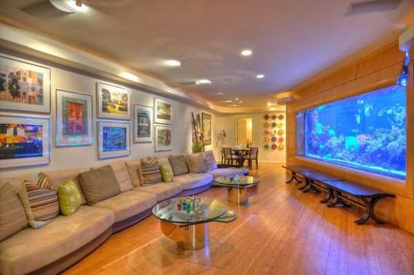 Мебель в гостиную тоже можно дополнить аквариумами, особенно интересно смотрятся два идентичных аквариума расположенных по бокам от телевизора. Кроме того нельзя не отметить импровизированные стены вокруг диванов – загляденье.