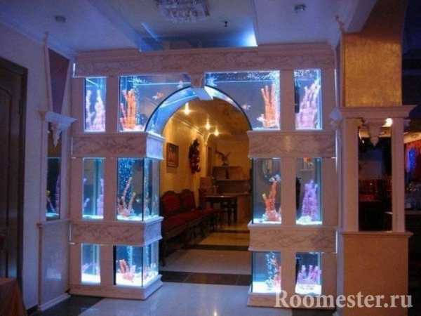 Аквариумные арки, что может быть еще более необычным для декора помещения. Причем арка может быть не только оконной или дверной, но и располагаться у изголовья кровати.