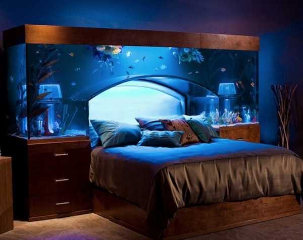 Красиво смотрятся аквариумные арки, которые располагают не только на границе двух комнат, но и в изголовье кровати.