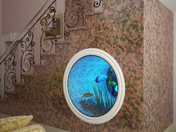 Пространство под лестницей часто не знают, как использовать. Хорошим решением будет устроить тут аквариум с разноцветными живыми обитателями.